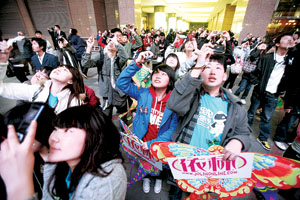 而表針指向9點(diǎn)10分時(shí),MV卻沒有如期播出。正當(dāng)大家都仰頭盯著天幕看時(shí),發(fā)現(xiàn)十幾名歌迷又同時(shí)朝一個(gè)方向跑去。