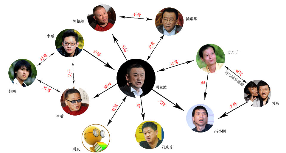 原本大家關(guān)注周立波是因?yàn)樗那蹇、他的八卦,現(xiàn)在關(guān)注周立波緣于他和網(wǎng)民們的一場口舌之戰(zhàn)。“若將網(wǎng)絡(luò)民意當(dāng)真,實(shí)是一種‘自宮’行為”,周立波在微博上發(fā)聲后,隨即又提出“網(wǎng)絡(luò)公廁論”。在引起眾多網(wǎng)友的不滿后,“打假斗士”方舟子、孔慶東和葉匡正也被卷入其中! [詳細(xì)]