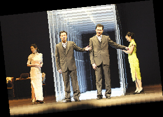 如果你中途進(jìn)場(chǎng),舞臺(tái)上8個(gè)人走來(lái)走去可能會(huì)讓你有點(diǎn)摸不著頭腦。穿著一樣的西裝背心和西褲的兩個(gè)振保,辛柏青代表世俗的、不得不扮給社會(huì)看的表象的振保,而高虎則代表內(nèi)心的那個(gè)不時(shí)想出軌、不時(shí)與自己斗爭(zhēng)的內(nèi)心的振保。而紅玫瑰和白玫瑰也都有兩個(gè),同樣一個(gè)是內(nèi)心想做的、一個(gè)是表象必須做的:你可以看到秦海璐飾演的紅玫瑰在與振保調(diào)情,而舞臺(tái)后方另一個(gè)與她同樣打扮的紅玫瑰還在與丈夫王士洪悠閑地聽(tīng)著唱片;你可以看到胡靖釩飾演的白玫瑰在囑咐丈夫振!俺鲩T記得帶傘”,而在她身后另一個(gè)白玫瑰正在與小裁縫曖昧地聊天……一開(kāi)始還真有點(diǎn)不適應(yīng),可看進(jìn)去卻覺(jué)得這種形式非常新奇有趣。經(jīng)常是,2個(gè)振保、4朵玫瑰,加上王士洪和小裁縫8個(gè)人一起出現(xiàn)在舞臺(tái)上,一起說(shuō)話、一起行動(dòng),奇怪的是,作為觀眾的你并不覺(jué)得混亂。舞臺(tái)形式也很有趣,舞臺(tái)中央一道玻璃通道,2個(gè)振保一同從幕后走進(jìn)通道,然后分別打開(kāi)通道兩側(cè)的門,一個(gè)走進(jìn)現(xiàn)實(shí)生活中與白玫瑰的家,另一個(gè)走進(jìn)另一側(cè)與紅玫瑰的回憶。