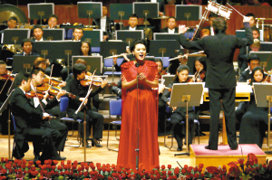 下半場,著名小提琴家文薇身著孔雀綠的露肩晚禮服與粉紅色的高跟鞋炫麗登場,演出了炫技的名曲圣·桑的《引子與回旋隨想曲》;稍后壓軸的著名歌唱家譚晶身穿紅色晚禮服亮相,一連唱了三首頗具民族特色的歌曲《在那東山頂上》、《大紅公雞毛腿腿》和《青藏高原》,將音樂會帶入了高潮。