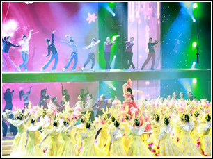 歌舞類節(jié)目時(shí)長(zhǎng)為1小時(shí),記者粗略計(jì)算,僅上半場(chǎng)的歌舞類節(jié)目就占了近50分鐘。開場(chǎng)舞《飛向春天》由185位女舞者共同完成,她們不斷變換隊(duì)形,時(shí)而如花潮涌動(dòng),時(shí)而像火山噴發(fā),熱鬧而奢華;舞蹈《飛天》題材獨(dú)特,7位女孩宛若傳說(shuō)中的七仙女,舞步婀娜多姿。歌曲方面,費(fèi)玉清有幸獨(dú)唱《千里之外》,其他歌曲則多以串燒形式登臺(tái),龐龍的《啷咯情歌》、鳳凰傳奇的《月亮之上》、黃圣依的《天天向上》、胡楊林的《香水醉》、張瀾瀾的《一家人》、郭美美的《不怕不怕》分別占據(jù)流行板塊和新人板塊。