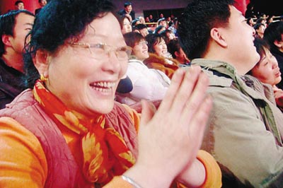 “‘裝’你們知道不?‘裝’在我們東北就是‘顯擺’的意思。你說我老師(指魏積安扮演的田教授)他多能裝呀!花5000塊錢買雙皮鞋,6000塊錢買塊手表,7000塊錢鑲口大金牙,然后一見我面就這樣:你看現(xiàn)在都8點(diǎn)了,我一會(huì)請(qǐng)你吃飯,你要不去我踢你……”這一段新加的臺(tái)詞配合著小沈陽夸張的齜牙咧嘴的動(dòng)作,把現(xiàn)場的觀眾都笑翻了。坐在記者身邊一位40多歲的大姐一連笑一邊捂肚子,記者問她是東北人嗎?能聽懂小沈陽的笑料嗎?大姐還滿臉的納悶:“這還用分哪兒地方的人嗎?誰聽誰不樂呀!”從昨日的現(xiàn)場來看,為了突出小沈陽的個(gè)人魅力,有長達(dá)一分半鐘的時(shí)間都是小沈陽一個(gè)人在舞臺(tái)上脫口秀,而這段臺(tái)詞的“笑”果確實(shí)不同凡響,引起的笑聲比其余7分鐘都多。
