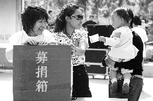 5月18日下午,國美第一城的部分居民在社區(qū)廣場上表演唱歌、朗讀等節(jié)目,以吸引眾人前來捐款,當(dāng)天獲捐數(shù)額達到了1萬多元。本報記者 王嘉寧 攝