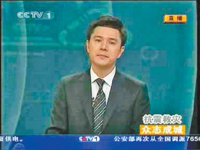 “為什么我們總是被這樣的聲音,這樣的畫面感動(dòng),為什么我們總是看著看著就會(huì)眼含熱淚,”5月14日中午,趙普在主持央視“眾志成城 抗震救災(zāi)”地震直播節(jié)目,當(dāng)看到前方記者發(fā)回的報(bào)道畫面后,趙普禁不住哽咽了。觀眾可以明顯地看到,趙普的眼眶濕潤(rùn)了,為此他不得不低頭調(diào)整一下情緒。