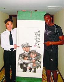 牙買加飛人博爾特在奧運(yùn)會(huì)百米決賽中以9秒69震驚世界,昨日記者獲悉,博爾特與山東濟(jì)寧的一位農(nóng)民畫家還有一段小故事——— 奧運(yùn)開幕前夕,博爾特隨牙買加體育代表團(tuán)在天津訓(xùn)練時(shí),濟(jì)寧畫家房貽德特意托人向博爾特贈(zèng)送了一幅抗震救災(zāi)題材國畫,博爾特欣然接受,并回贈(zèng)了一件他的簽名運(yùn)動(dòng)服。