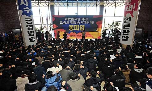12月26日,MBC電視臺開始加入總罷工的行列。繼新聞節(jié)目《News Desk》主播樸惠珍罷工之后,主持人文智愛和孫正恩也相繼加入罷工行列。據(jù)悉,此次罷工的起因是韓國媒體工會為了反對韓國執(zhí)政黨大國家黨正在推進的媒體相關法案修正案。
