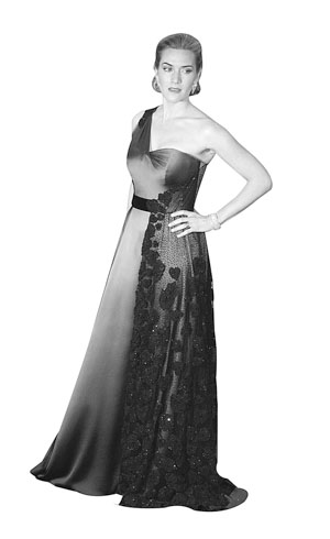 凱特·溫斯萊特所穿的是圣羅蘭品牌的鐵灰色單肩禮服,價值數(shù)千美元。