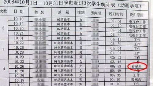近日,北影校園內(nèi)張榜公布了各系晚歸同學的名單,把超過3次晚歸的學生和詳細原因都公布了出來。在網(wǎng)友上傳的晚歸名單中,晚歸的理由有“電視臺工作”、 “吃飯”、“回家”、“拍戲”等,最讓網(wǎng)友意外的是有一名同學的晚歸理由是“看星星”。根據(jù)網(wǎng)友上傳的這份晚歸名單,“看星星”的這名女同學在2008年 10月26日晚第四次晚歸,接近凌晨1點才回宿舍。