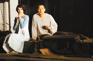 舞臺上,絕對主角濮存昕忽而瘋癲忽而安靜,還要不停地在舞臺上穿梭、奔跑、跳躍、吶喊,連觀眾都替他喊累。56歲的濮存昕還與30歲的高圓圓大談“忘年戀”,時而低頭密語,時而牽手狂奔,最為精彩的地方就是濮存昕將高圓圓攔腰熊抱而起。