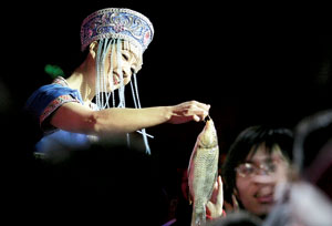 見(jiàn)柚子落到身邊的人手中,一位觀眾嘆著氣剛要坐下,徐鳳美身子一晃,又變出一條鮮魚(yú)送給他。意外的收獲令這位觀眾張大了嘴巴,全場(chǎng)響起掌聲。