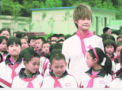 稍后,海虹小學(xué)的所有學(xué)生都在操場(chǎng)上集合,春春身邊的小朋友從7、8個(gè)增加到100多個(gè)。人一多,場(chǎng)面就不好控制,這邊的孩子剛排好隊(duì),那邊就有人咳嗽,要不就是忘記面帶微笑。李宇春和孩子們熟悉起來(lái),還鼓勵(lì)他們笑起來(lái),“只要我們持續(xù)關(guān)愛(ài)四川,就會(huì)萬(wàn)物復(fù)蘇,奇跡來(lái)臨……”全場(chǎng)一起喊出最后的話:“四川依然美麗,中國(guó)更加美麗!”小朋友們和這位大姐姐一起面對(duì)鏡頭揮手,現(xiàn)場(chǎng)氣氛達(dá)到了最高潮。