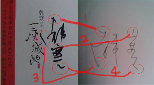 此外,該網(wǎng)友還拿出親自排隊(duì)得到的韓寒親筆簽名及網(wǎng)友貼的從韓寒淘寶店買來(lái)的簽名,分析其筆跡,該網(wǎng)友斷言,韓寒賣書(shū)的簽名都是韓爸爸或其他人代簽的。
