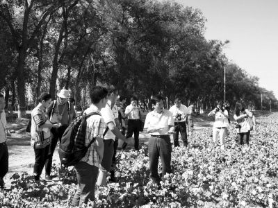 9月4日,參加“文化中國(guó)——海外華文媒體新疆行”的媒體代表到石河子采訪。石河子市外僑辦主任高輿陶(中)向媒體團(tuán)成員介紹當(dāng)?shù)胤N植棉花的情況!拔幕袊(guó)——海外華文媒體新疆行”采訪活動(dòng)由中國(guó)國(guó)務(wù)院僑辦和新疆維吾爾自治區(qū)僑辦主辦,有來(lái)自美國(guó)、加拿大、法國(guó)等23個(gè)國(guó)家和地區(qū)的40家華文報(bào)紙、雜志、電視臺(tái)參加。(張紅攝)