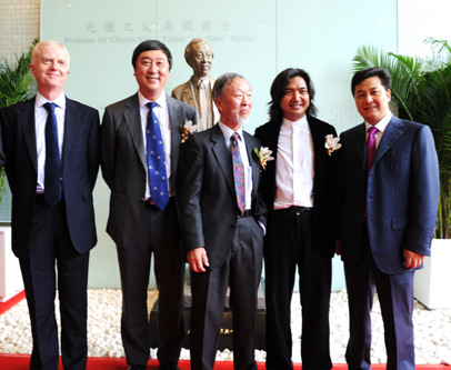 中新網(wǎng)9月29日電 據(jù)寧夏僑聯(lián)消息,9月27日,香港中文大學(xué)舉行了高錕雕像揭幕典禮,由諾貝爾物理學(xué)獎(jiǎng)高錕伉儷、校長沈祖堯教授及著名雕塑家吳為山教授主禮,中國僑聯(lián)副主席朱奕龍應(yīng)邀參加揭幕儀式,與中大校領(lǐng)導(dǎo)、教授以及人文學(xué)者等師生代表近百余人共襄盛舉。
