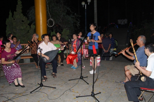 在金川前的小廣場上,文藝晚會依舊豐富多彩,激情動感的舞蹈、詼諧幽默的小品、悠揚美妙的器樂彈唱贏來了一波又一波的掌聲和笑聲。而在秋中湖旁的小涼亭里,有支特別的樂隊也吸引了不少老師學生駐足聆聽,他們是由華僑大學退休教職工組成的南音演奏社。老人家們彈著琵琶,吹著筒蕭,拉著二弦三弦,吟唱一首又一首韻味悠長的南音樂曲。來自橋南小學的幾名學生也來助陣,老少合作的表演別樣溫馨。今年已經七十一歲的張彬彬女士表示,他們同是喜愛南音的老職工,她退休以來已經學了七八年的南音了,能把南音這一傳統(tǒng)文化傳播給更多人,他們都很開心。