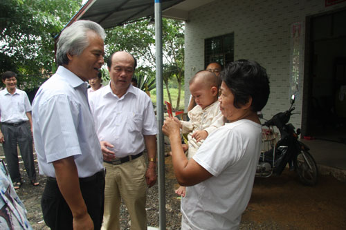 中新網(wǎng)10月11日電 據(jù)海南省外僑辦消息,今年國慶期間海南強降雨給全省華僑農(nóng)場職工群眾生產(chǎn)生活造成了巨大損失。災(zāi)情牽動著各級領(lǐng)導(dǎo)的心,10月10日上午,海南省外事僑務(wù)辦主任吳士存、副主任折志凌率隊深入文昌華僑農(nóng)場及?谑芥(zhèn)北鋪村查看災(zāi)情,看望并慰問受災(zāi)群眾,把黨和政府的溫暖送到他們心坎。