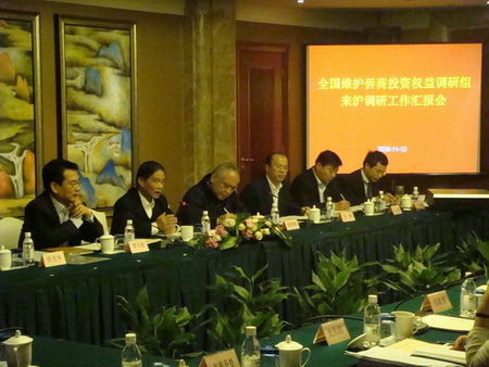 12日下午,上海維護(hù)僑商投資權(quán)益聯(lián)合調(diào)研工作匯報會和僑商座談會在上海衡山賓館召開。上海市僑辦主任崔明華向調(diào)研組匯報了上海維護(hù)僑商權(quán)益工作的基本情況、基本做法、主要體會和工作建議。上!拔鍍S”及相關(guān)委辦局的負(fù)責(zé)人參加匯報會并介紹上海各部門維護(hù)僑商權(quán)益工作情況。