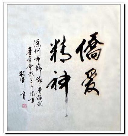 根據(jù)年初深圳市僑聯(lián)常委會的會議精神及市歸僑僑眷福利基金會的工作計劃,基金會將舉辦市歸僑僑眷福利基金會20周年紀念活動,以對所有支持關心過基金會的領導和社會知名人士表示感謝,并出一本基金會紀念冊,以紀念基金會成立以來的風雨歷程。當參加廣東省第九次僑代會的廣東省僑聯(lián)常委、深圳市歸僑僑眷福利基金會副理事長劉偉良邀請林軍為市歸僑僑眷福利基金會題詞時,林軍欣然應允,當即揮筆疾書“僑愛精神”,為市歸僑僑眷福利基金會成立20 周年獻禮。