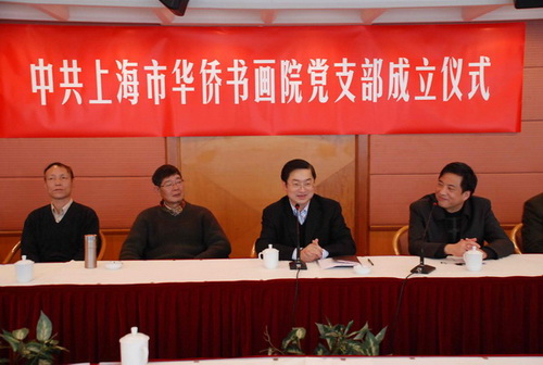 上海市僑辦主任、黨組書記崔明華出席并講話。他高度評(píng)價(jià)了華僑書畫院的書畫家們?cè)诤霌P(yáng)中華優(yōu)秀傳統(tǒng)文化、熱衷社會(huì)公益事業(yè)等方面作出的積極貢獻(xiàn),向加入書畫院黨組織的黨員書畫家們表示熱誠(chéng)地歡迎。