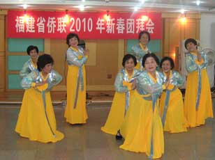 團拜會由福建省僑聯(lián)副主席謝小建主持,黨組成員翁祖根出席。會上,來自福建省僑聯(lián)藝術(shù)團和福州市離退休歸僑聯(lián)誼會的藝術(shù)家們還帶來了精彩的文藝節(jié)目。輕松歡快的女生小組唱、獨具異域風(fēng)情的印尼舞蹈、剛?cè)岵拿坊ㄈ⒔】禃r尚的太極柔力球表演、清新悠揚的女聲獨唱、優(yōu)美動人的朝鮮舞蹈,藝術(shù)家們的表演博得了陣陣掌聲。