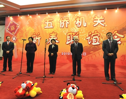 中新網(wǎng)2月12日電 據(jù)中國僑聯(lián)網(wǎng)消息,虎步奔騰開勝景,春風浩蕩展鴻圖。2月8日下午,首都大酒店洋溢著節(jié)日的喜慶氣氛。中央“五僑”機關(guān)在這里隆重舉行2010年新春聯(lián)歡會!拔鍍S”機關(guān)干部職工和離退休老干部400多人歡聚一堂,喜迎新春佳節(jié)。