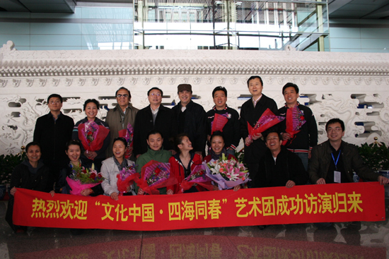中新社北京3月9日電 (南若然)結(jié)束在南美四國(guó)23天的慰?jī)S巡演之后,9日下午,“文化中國(guó)·四海同春”赴南美洲藝術(shù)團(tuán)載譽(yù)返回北京。該團(tuán)團(tuán)長(zhǎng)、國(guó)務(wù)院僑辦副主任馬儒沛在首都機(jī)場(chǎng)接受中新社記者采訪時(shí)表示,赴南美巡演“鵬程數(shù)萬里,廣交四方友,笑迎八面風(fēng),演繹中華情”,并創(chuàng)造了四個(gè)之最。