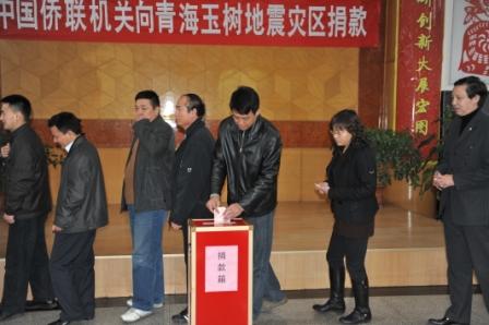 中國(guó)僑聯(lián)副主席李祖沛現(xiàn)場(chǎng)傳達(dá)了中共中央政治局委員、全國(guó)人大常委會(huì)副委員長(zhǎng)王兆國(guó)對(duì)僑聯(lián)開展玉樹抗震救災(zāi)的指示精神和林軍對(duì)玉樹抗震救災(zāi)的批示精神,指出要把廣大歸僑僑眷和海外僑胞支援抗震救災(zāi)的熱情引導(dǎo)并融入黨政主導(dǎo)的抗震救災(zāi)行動(dòng)中去,并號(hào)召機(jī)關(guān)廣大干部職工要大力發(fā)揚(yáng)“一方有難、八方支援”的精神,心系災(zāi)區(qū)、情系災(zāi)民,以實(shí)際行動(dòng)幫助災(zāi)區(qū)群眾渡過(guò)難關(guān)。隨后,舉行了中國(guó)僑聯(lián)機(jī)關(guān)向青海玉樹地震災(zāi)區(qū)捐款活動(dòng)。中國(guó)僑聯(lián)黨組書記、主席林軍、副主席李祖沛、董中原、王永樂(lè)帶頭向?yàn)?zāi)區(qū)捐款,出差在外的副主席喬衛(wèi)也委托他人捐款。