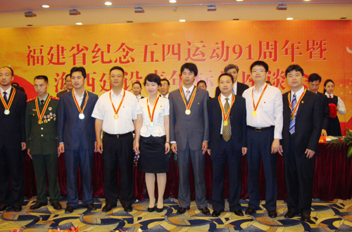 中新網(wǎng)5月6日電 據(jù)思明區(qū)僑聯(lián)消息,5月4日上午,在福建省紀(jì)念五四運(yùn)動(dòng)91周年暨海西建設(shè)青年標(biāo)兵座談會(huì)上,福建省廈門市思明區(qū)僑聯(lián)青委會(huì)會(huì)長(zhǎng)、廈門鷺達(dá)眼鏡有限公司董事長(zhǎng)、高級(jí)經(jīng)濟(jì)師張和輝榮獲由中共福建省委組織部、福建省公務(wù)員局(福建省人力資源開發(fā)辦公室)、共青團(tuán)福建省委聯(lián)合頒發(fā)的第七屆“福建青年五四獎(jiǎng)?wù)隆薄?table border=0 cellspacing=0 cellpadding=0 align=left>
