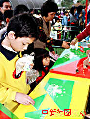 一名兒童在"喜迎澳門(mén)回歸,共創(chuàng)美好明天"園游會(huì)上認(rèn)真地拼裝澳門(mén)特區(qū)區(qū)旗圖案。澳門(mén)為紀(jì)念澳門(mén)基本法頒布六周年,于二十八日開(kāi)始舉行系列活動(dòng),以增強(qiáng)人們的回歸意識(shí)。