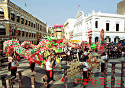 澳門議事廳前地獅龍齊舞,歡歡喜喜慶賀農(nóng)歷兔年的到來。