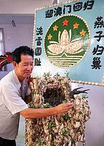 浙江省玉環(huán)縣水族工藝館原館長鄭高金,最近用一千五百多只貝殼創(chuàng)作了一件迎澳門回歸的貝雕作品「燕子歸巢」。