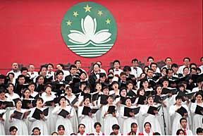 北京十五家文藝團(tuán)體十日下午在天安門廣場舉行“迎澳門回歸倒計(jì)時(shí)一百天大型音樂會(huì)”。來自香港、澳門和內(nèi)地近千名歌唱家在澳門特區(qū)區(qū)徽下高歌《歡樂頌》。