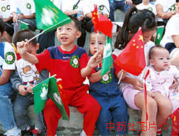 一些澳門兒童在街頭揮舞中華人民共和國國旗與澳門特別行政區(qū)區(qū)旗,慶祝澳門回歸倒計(jì)時(shí)五十天。