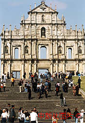 大三巴牌坊是建于三百年前的圣保祿教堂在1853年失火燒毀后,剩下的前壁。這座中西合璧的建筑藝術杰作,目前已成為澳門的歷史象征。