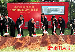澳門中華總商會建造"澳門回歸紀(jì)念亭"動土儀式三十日在澳門何賢公園舉行,澳門特區(qū)首任行政長官何厚鏵(左五)、澳門中華總商會會長馬萬祺(左四)、新華社澳門分社副社長宗光耀(左三)等嘉賓出席。