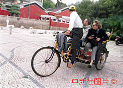 許多外國(guó)游客回歸前親臨澳門,乘坐獨(dú)特的人力三輪車觀賞葡萄牙當(dāng)年登上澳門的媽閣廟。中新社傳真