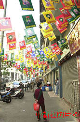 澳門(mén)小街滿(mǎn)掛慶祝回歸的彩旗,洋溢歡樂(lè)氛圍。