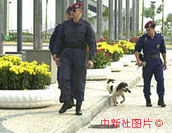 澳門特警隊員帶領(lǐng)警犬在政權(quán)交接場地四周巡羅檢查。
