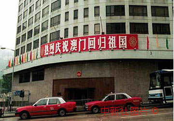 澳門回歸祖國在即,香港各界舉辦多項(xiàng)慶祝活動,新華社香港分社大樓高掛標(biāo)語,彩旗,迎接澳門回歸祖國。中新社傳真 洪少葵 攝