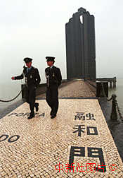 澳門警察在海濱紀(jì)念建筑融和門前執(zhí)勤。中新社傳真 彭振戈攝