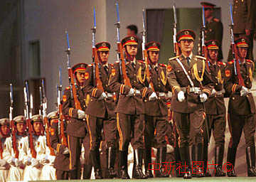 中國人民解放軍三軍儀仗隊進入澳門政權交接大廳,執(zhí)行盛典禮儀。中新社傳真 毛建軍攝