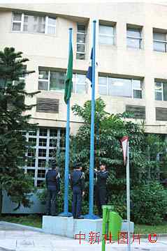 澳門治安警察局舉行升旗儀式。擁有四千多名警察的治安警察局是當(dāng)日零點(diǎn)將原治安警察廳中的“廳”換掉而改為本名的。 中新社傳真 曾憲成攝