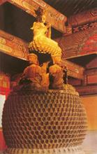 藏經(jīng)閣位于寺院的最后一進(jìn)院落。上下兩層,均為東西面闊五間,南北進(jìn)深三間。外觀呈現(xiàn)朱紅色,青灰色的殿頂。檐枋等施以花卉人物故事為題材的精美彩繪。閣東西兩側(cè)有朱紅小樓,扶廓將小樓與主樓邊接成一體,使建筑顯得格外緊湊別致。